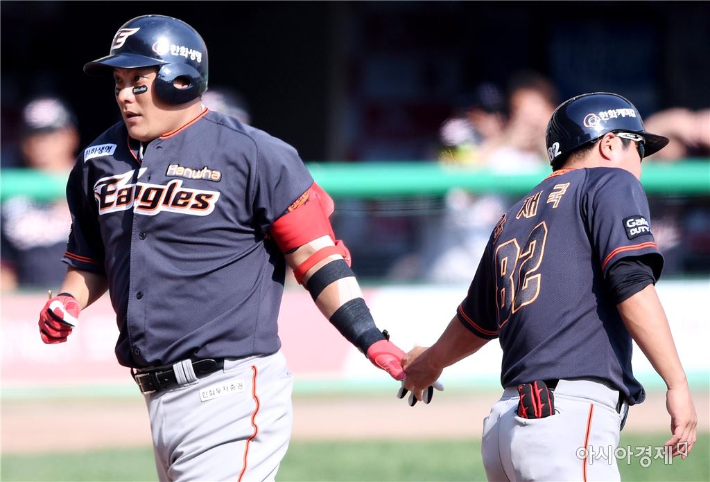 [인천=아시아경제 김현민 기자] 프로야구 한화 이글스와 SK 와이번스의 2016 KBO리그 경기가 25일 인천 SK행복드림구장에서 열렸다. 4회초 무사 1루에서 한화 김태균이 SK 선발 윤희상을 상대로 투런 홈런을 치고 윤재국 코치와 하이파이브하고 있다. 김현민 기자 kimhyun81@asiae.co.kr<ⓒ세계를 보는 창 경제를 보는 눈, 아시아경제(www.asiae.co.kr) 무단전재 배포금지>