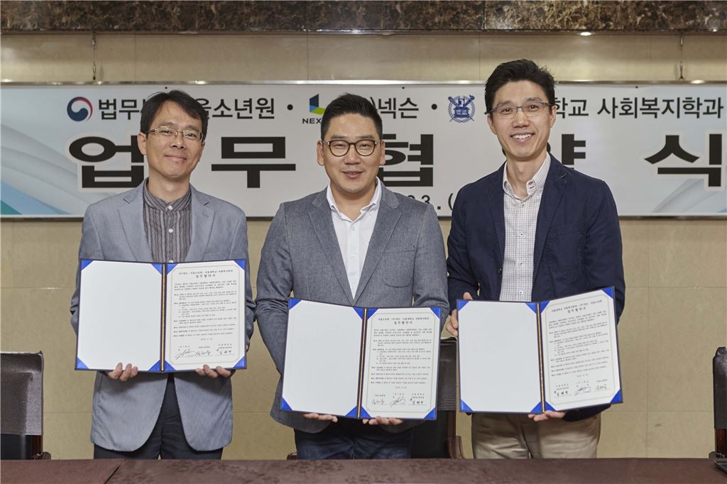 강민혁 넥슨 대외정책이사(가운데), 박정민 서울대학교 사회복지학과 교수(맨 오른쪽), 김용운 서울소년원 행정지원과장