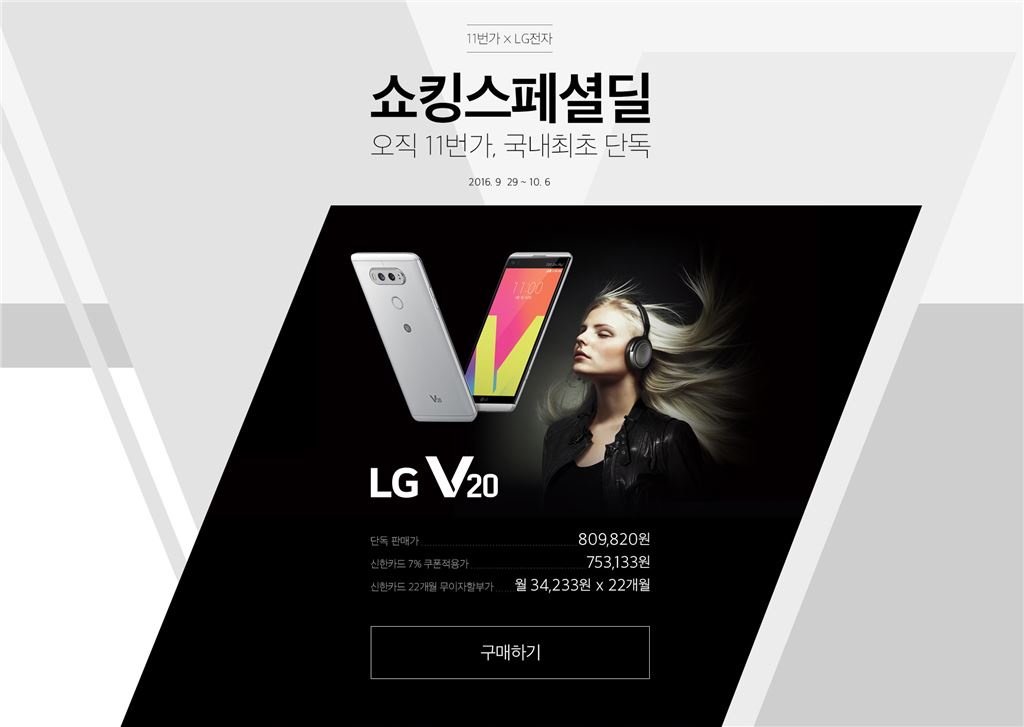 신한카드 무이자할부, 10% 할인쿠폰에 V20출시 프로모션 혜택과 11번가에서만 받을 수 있는 5가지 추가 사은품 제공[아시아경제 지연진 기자]SK플래닛 11번가가 다음달 6일까지 LG전자 최신 스마트폰 V20 무약정폰을 오픈마켓 단독 판매한다.무약정폰은 통신사 약정없는 공기계 스마트폰으로 내가 원하는 통신사를 선택해 요금제를 마음대로 골라 가입할 수 있으며 각 통신사가 제공하는 20% 요금약정할인을 받을 수 있어 경제적이다.29일 출시된 LG전자 V20은 뱅앤올룹슨 플레이(B&O)와 합작해 세계 최초로 32비트 쿼드 DAC 을 탑재하고 일반 CD음질의 16배 이상의 고해상도 음원을 감상할 수 있어 화제가 됐다. 뿐만 아니라 전후면 카메라에 모두 광각렌즈를 장착해 더욱 다양한 사진촬영과 셀카기능들을 이용할 수 있게 됐다.11번가에서 V20무약정폰을 구매하면 LG전자가 제공하는 출시 프로모션 혜택*과 함께 11번가 단독 론칭을 기념해 액정필름, 젤리케이스, 차량용·가정용 충전기 등 5가지 추가 사은품을 증정할 계획이다.LG V20 무약정폰의 판매가는 98만9780원이며 신한카드 22개월 무이자할부와 선착순 하루 5백명에게 10% 할인 쿠폰을 제공한다.지연진 기자 gyj@asiae.co.kr<ⓒ세계를 보는 창 경제를 보는 눈, 아시아경제(www.asiae.co.kr) 무단전재 배포금지>
