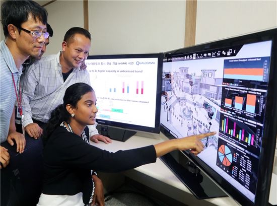 SK텔레콤과 퀄컴의 연구원들이 29일 SK텔레콤 분당 기술원에서 LTE 용 주파수(면허대역)와 WiFi용 주파수(비면허대역)를 묶어서 업링크와 다운링크에 모두 이용하는 ‘비면허대역 주파수 집성‘ 기술을 실험하고 있다.(사진=SK텔레콤)