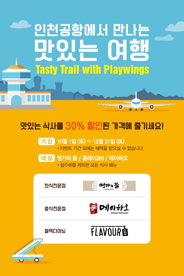 [아시아경제 이주현 기자]풀무원 이씨엠디가 인천국제공항 외식 매장 할인 이벤트를 실시한다.이씨엠디는 10월1일부터 12월31일까지 맞춤형 특가항공권 예매 애플리케이션 ‘플레이윙즈’ 이용자 전원에게 인천국제공항 이씨엠디 외식매장에서 사용 가능한 30% 할인권을 제공한다고 29일 밝혔다.‘인천공항에서 만나는 맛있는 여행’이라는 콘셉트로 진행하는 이번 이벤트는 플레이윙즈에 가입한 모든 이용자들에게 이씨엠디가 운영하는 인천국제공항 외식매장 ‘명가의 뜰’, ‘플레이보6’, ‘메이하오’ 등 총 3곳에서 사용할 수 있는 할인권 제공한다. 할인권은 ‘플레이윙즈’ 앱에서 다운로드 받을 수 있으며, 식사 후 결제할 때 제시하면 된다.‘명가의 뜰’은 우리나라 각 지역 대표 음식들을 맛볼 수 있는 한식 전문점으로 ‘명가한우 안동식 명탕’과 ‘고등어 구이와 해물풍년 순두부 한상’이 인기를 끌고 있다.‘플레이보6’는 부대찌개 브랜드 ‘놀부부대찌개‘와 부산지역 대표 돈까스 전문점 ’본까스델리‘, 철판 비빔밥 전문점 ‘무쇠화반’ 등 전국 유명 맛집을 한 곳에서 만나볼 수 있는 편집숍이다.‘메이하오’는 캐주얼 중식 브랜드로 ‘얼큰문어짬뽕’, ‘찹쌀탕수육’ 등이 인기를 끌고 있는 인천공항 내 유일한 중식당이다.구병조 이씨엠디 컨세션사업본부 본부장은 “인천국제공항 내 외식 매장을 비롯해 스카이허브라운지, 인터넷 카페 등 다양한 매장을 운영하고 있는 이씨엠디가 고객들의 성원에 보답하고자 이번 프로모션을 준비했다”며 “든든하고 맛있는 한끼 식사가 인천국제공항 이용자들의 즐거운 여행 경험 중 하나가 되길 바란다”라고 말했다.한편, 플레이윙즈는 특가 항공권 정보를 실시간으로 제공하는 모바일 애플리케이션 서비스다. 2016년 9월 말 기준 누적 사용자가 100만여명으로 특가 모바일 항공권 서비스 중 가장 많은 사용자를 보유하고 있다.이주현 기자 jhjh13@asiae.co.kr<ⓒ세계를 보는 창 경제를 보는 눈, 아시아경제(www.asiae.co.kr) 무단전재 배포금지>