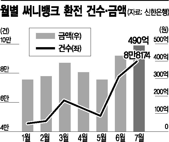 [아시아경제 손선희 기자] 신한은행 모바일 뱅킹 애플리케이션(앱) '써니뱅크'의 주력상품은 '환전'이다. 모바일 뱅킹 브랜드가 만들어지기 전부터 모바일 환전시장의 강자였던 신한은행이 써니뱅크를 출시하면서 날개를 단 셈이다. 신한은행은 업계 최초로 모바일 환전상품을 출시했다.써니뱅크를 통한 모바일 환전 건수는 올 상반기 동안에만 2배 가까이 늘었다. 신한은행에 따르면 지난달 써니뱅크 환전 건수는 8만8174건으로 지난 1월(4만5639)보다 약 93% 증가한 것으로 집계됐다. 환전금액도 1월 296억원에서 지난달 490억원으로 확대됐다. 월별로 살펴보면 환전 건수와 금액은 올 상반기 증가세를 보이다 본격 휴가철을 맞은 6월부터 크게 늘어난 것으로 분석된다.써니뱅크 환전이 입소문을 탄 비결은 이용 장벽이 낮다는 점과 편의성 두 가지다. 써니뱅크 '스피드업(Speed up) 누구나 환전'은 기존 신한은행 계좌가 없어도 누구에게나 90%의 우대 환율을 제공한다. 신한은행 비거래 고객의 경우 가상계좌를 활용한 무계좌 방식으로 환전을 신청할 수 있다.아울러 스마트폰에 앱을 설치한 뒤 간단한 절차를 거쳐 환전 금액과 수령처 등을 자유롭게 신청할 수 있다. 특히 미리 환전을 신청한 뒤 출국 당일 인천ㆍ김포공항 지점에서 곧바로 외화를 수령할 수 있다는 점이 인기 요인이다. 자동화기기(ATM)를 통해 1ㆍ10ㆍ100달러 등 권종도 자유롭게 분배해 신청 가능하다. 유동욱 신한은행 디지털뱅킹그룹장(부행장)은 "일반 영업점에서는 외화권종 보유현황에 따라 고객이 원하는 만큼 제공하지 못할 때가 종종 있는데, 써니뱅크 환전을 이용하면 미리 권종을 선택해 ATM을 통해 간편히 뽑아갈 수 있다"고 설명했다.써니뱅크 앱을 통한 비대면 대출도 점차 활성화되고 있다. 지난 2월 출시한 자동차 금융상품 '써니 마이카 대출'은 이달 2일 기준 총 8904건의 대출 신청이 접수됐다. 누적 취급 금액은 1818억7000만원으로 집계됐다.신한은행은 '현지화'를 통한 글로벌 시장에의 진출에도 적극적이다. 써니뱅크는 특히 베트남 현지 시장에서 호응을 얻고 있다. 신한은행은 비금융 콘텐츠 플랫폼 '써니클럽'을 통해 패션, 뷰티, 음식, 한국어 강의 등 베트남 고객이 선호하는 한류 콘텐츠를 제공하고 있다. 앱 내부에 탑재된 써니뱅크를 통해 현지 법인인 '신한베트남은행'의 카드나 신용대출 등 금융 서비스를 연계하는 방식으로, 이른바 '핀텐츠(핀테크+콘텐츠)' 전략이다.신한은행 관계자는 "베트남 고객이 선호하는 한류 콘텐츠를 활용한 마케팅"이라며 "현지 특성을 반영한 온라인투오프라인(O2O) 서비스 확대 등의 혁신을 해나갈 방침"이라고 밝혔다.손선희 기자 sheeson@asiae.co.kr<ⓒ세계를 보는 창 경제를 보는 눈, 아시아경제(www.asiae.co.kr) 무단전재 배포금지>