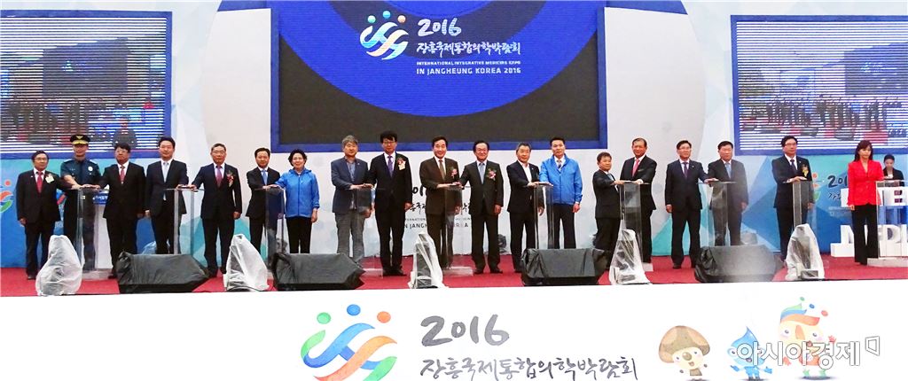 "29일 개막식에 4천여 명 참석…국내외 통합의학 다양한 체험의 장" [아시아경제 노해섭 기자]현대의학과 한의학, 검증된 대체의학을 한자리에서 체험할 수 있는 2016 장흥국제통합의학박람회가 29일 장흥 안양면 박람회장 특설무대에서 개막, 33일간의 대장정에 들어갔다.이날 개막행사에는 이낙연 전라남도지사, 보건복지부의 권덕철 실장, 임명규 도의회 의장, 황주홍 국회의원, 김성 장흥군수, 전세일 통합의학박람회 초대 조직위원장, 김필건 대한한의사협회장 등 4천여 명이 참석했다.‘통합의학, 사람으로 향하는 새로운 길을 열다’라는 주제로 열리는 이번 국제통합의학박람회는 주제존, 체험존, 교류존, 건강존 4개 구역으로 나눠 운영된다. 체험부스에서는 각종 진료, 체험, 상담, 검사가 모두 무료다.특히 지난해까지 개최됐던 6차례의 대한민국통합의학박람회와는 달리 전시 위주보다는 관객이 직접 체험을 즐길 수 있는 참여형 박람회, 소모적인 행사가 아닌 생산적인 박람회로 준비됐다.신설 운영되는 통합의학관에서는 한국인에게 많이 발생하는 10대 주요 질환에 대해 현대의학, 한의학, 보완대체의학 전문가의 협진을 통해 적절한 치료 방법을 소개한다. 해외 의료기관 46개 국가(아시아 22·유럽 15·아메리카 4·오세아니아 2·아프리카 3)가 참가해 각 나라의 통합의료를 선보인다. 이는 그동안 치러진 대한민국통합의학박람회보다 6배 이상 많은 규모다. 국내에선 175개 의료기관이 참여한다.