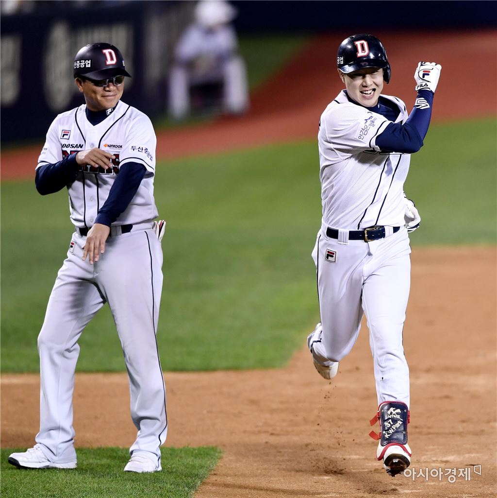 [아시아경제 김현민 기자]프로야구 넥센 히어로즈와 두산 베어스의 2016 KBO리그 경기가 29일 잠실구장에서 열렸다. 3회말 2사에서 두산 박건우가 넥센 선발 밴헤켄을 상대로 선제 솔로 홈런을 치고 전형도 코치와 하이파이브하고 있다. 김현민 기자 kimhyun81@asiae.co.kr<ⓒ세계를 보는 창 경제를 보는 눈, 아시아경제(www.asiae.co.kr) 무단전재 배포금지>