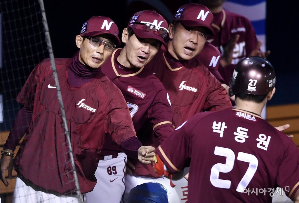 [아시아경제 김현민 기자]프로야구 넥센 히어로즈와 두산 베어스의 2016 KBO리그 경기가 29일 잠실구장에서 열렸다. 4회초 무사 2루에서 넥센 박동원이 두산 선발 허준혁을 상대로 역전 투런 홈런을 치고 염경엽 감독과 하이파이브하고 있다. 김현민 기자 kimhyun81@asiae.co.kr<ⓒ세계를 보는 창 경제를 보는 눈, 아시아경제(www.asiae.co.kr) 무단전재 배포금지>