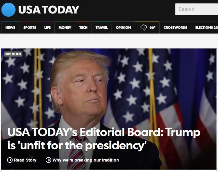 ▲USA 투데이가 트럼프 반대 의사를 밝히며 메인 페이지에 걸어놓은 사설. (사진 = 사이트 캡쳐)