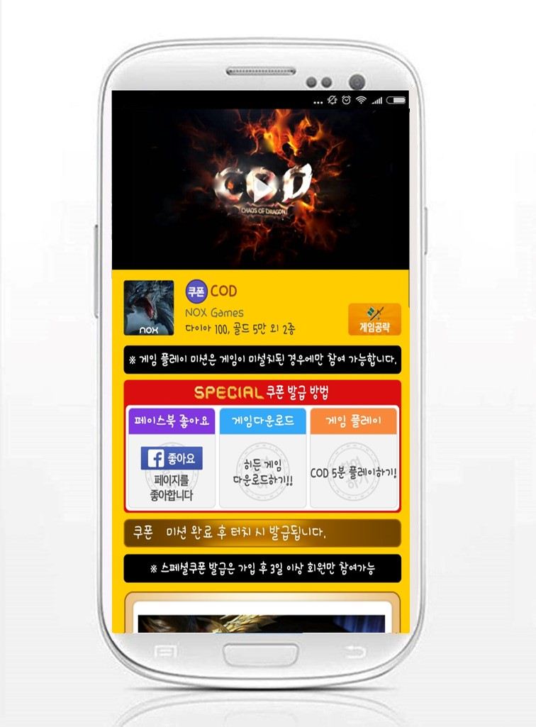 이번에 쿠폰을 추가한 게임은 모바일 RPG 'COD(Chaos Of Dragon)'로 '페이스북 페이지 좋아요', '히든 게임 다운로드', '5분 플레이' 세 가지 미션을 완료한 유저 모두에게 '다이아 100개', '마철광 400개', '강화석 1000개', '5만 골드'를 증정한다.녹스게임즈가 서비스하는 'COD'는 빠른 템포의 실시간 전투와 화려한 그래픽이 특징인 모바일게임으로, 카드시스템을 통한 카드 강화 및 교환을 비롯해 진화, 전승, 제련 등 다양한 육성 콘텐츠를 통해 전략적 재미를 느낄 수 있다.열 가지 '용혼'과 용혼의 유령 '혼장'의 소환으로 다양한 영웅을 조합할 수 있는 본 게임은 지난 19일 정식 서비스를 시작했으며, 구글 플레이스토어와 애플 앱스토어에서 다운로드 가능하다.'모비'는 사전등록 기능뿐 아니라 일반 게임쿠폰 및 유저가 미션을 수행해야 발급되는 스페셜 게임쿠폰, 유저간의 쿠폰 나눔, 게임 추천 및 사전 테스트 참가 등 다양한 기능을 한자리에 구현하였다. '리니지2: 레볼루션', '메이플스토리M', '붉은보석2' 등 출시 예정이거나 막 출시한 모바일게임 기대작의 사전예약 및 무료 쿠폰을 받을 수 있어 유저들로부터 폭발적인 반응을 얻고 있다.온라인이슈팀 issue@asiae.co.kr<ⓒ세계를 보는 창 경제를 보는 눈, 아시아경제(www.asiae.co.kr) 무단전재 배포금지>