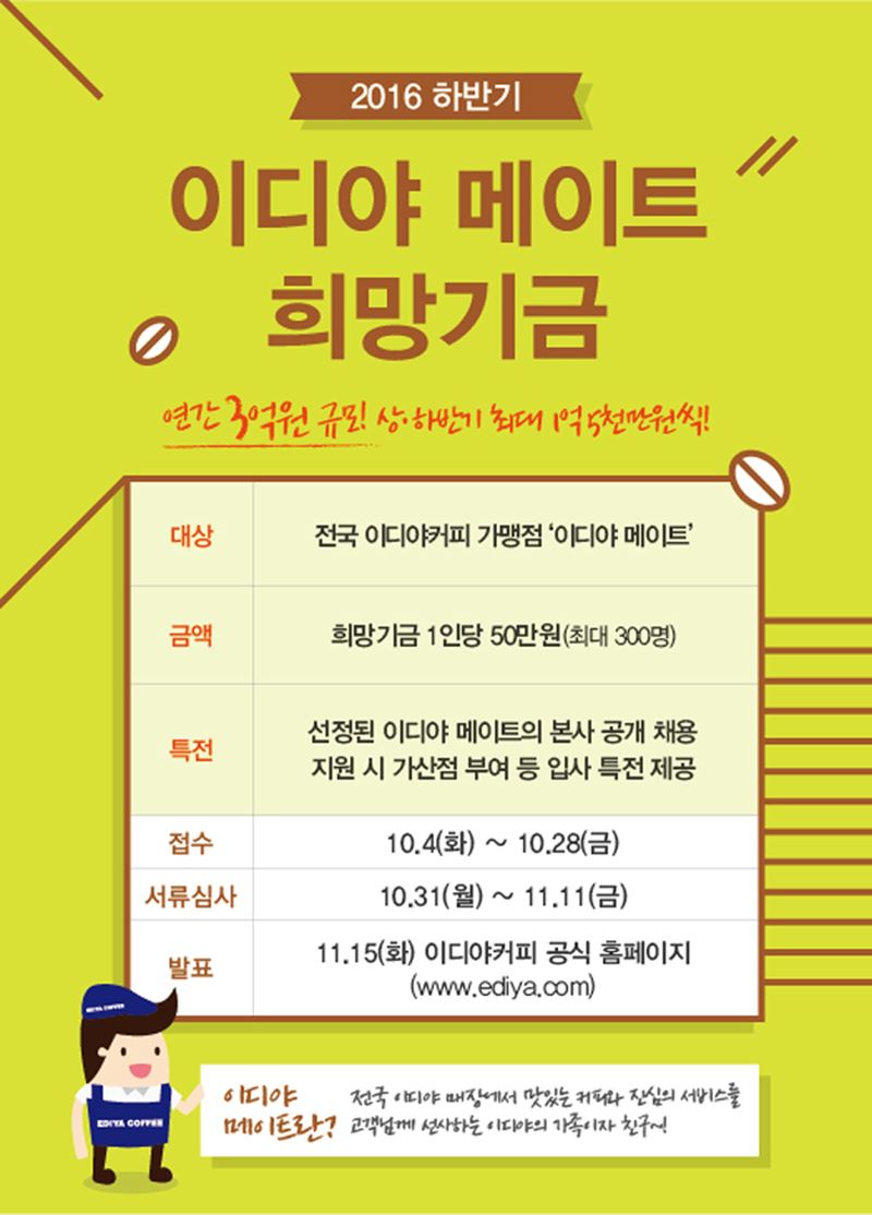 [아시아경제 오주연 기자]이디야커피가 이달 28일까지 2016 하반기 '이디야 메이트 희망기금' 지원자를 모집한다고 4일 밝혔다.이디야 메이트 희망기금은 전국 이디야커피 매장에서 근무하고 있는 이디야 메이트의 꿈을 지원하기 위한 기금사업으로, 1인 50만원의 희망기금을 수여한다. 이디야커피는 올해부터 최대 연 3억원 규모로 기금을 증액해 더 많은 이디야 메이트에게 혜택이 돌아가도록 했다. 8회째를 맞고 있는 이디야 메이트 희망기금은 이번 하반기 모집에서 최대 300명에게 희망기금을 수여할 예정이다. 지원은 신청 접수 마감일을 기준으로 6개월 이상 근무한 이디야 메이트라면 연령과 학력에 관계없이 누구나 가능하다. 지원신청서와 근로계약서 사본, 사회적 취약계층 증빙서류(대상자에 한함)를 이메일·우편 또는 이디야 슈퍼바이저를 통해 접수하면 된다. 심사는 지원신청서를 바탕으로 이루어지며 근속일수가 많을수록 가산점을 부여한다. 또한 취약계층은 심사 시 우대한다. 선정된 이디야 메이트에게는 희망기금을 수여하고, 본사 공개채용 지원 시 가산점을 부여하는 입사 특전을 함께 제공한다. 결과발표는 다음달 15일 이디야커피 공식 홈페이지에 공지될 예정이다. 오주연 기자 moon170@asiae.co.kr<ⓒ세계를 보는 창 경제를 보는 눈, 아시아경제(www.asiae.co.kr) 무단전재 배포금지>