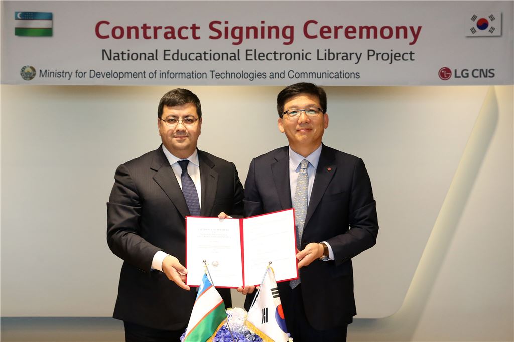 미르자키도프(Mirzakhidov K.M) 우즈베키스탄 정보통신기술개발부 장관(왼쪽)과 박진국 LG CNS 금융/공공사업부장(전무)