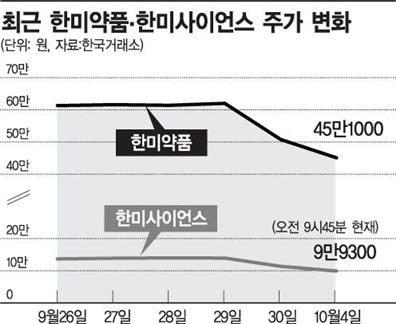 [아시아경제 권해영 기자] 8000억원 규모의 기술수출 계약이 취소됐다는 악재성 공시로 한미약품 주가가 급락하면서 임성기 한미약품 회장을 포함한 오너 일가의 지분가치가 이틀만에 2조원이나 증발했다. 기관, 외국인 투자자들은 악재가 터진 날 한미약품을 던진 반면 개인 투자자들은 한미약품을 2000억원 넘게 순매수하면서 이번에도 '개미'가 투자손실을 고스란히 떠안았다. 4일 오전 9시45분 현재 한미약품 주가는 전거래일 대비 11.41%(5만8000원) 급락한 45만원에 거래중이다. 한미사이언스 주가는 전일보다 12.89%(1만4700원) 떨어진 9만9300원을 기록중이다. 지난달 30일 한미약품과 한미사이언스 주가가 전거래일 대비 각각 18.06%(11만2000원), 18.28%(2만5500원) 급락으로 장을 마감한 데 이어 이틀째 급락세가 이어졌다. 이에 따라 이 시각 현재 한미약품과 한미사이언스 주가는 8000억원 규모의 베링거인겔하임 기술수출 계약 해지 사실이 공시된 이후 지난달 29일 대비 27.41%(17만원), 28.81%(4만200원) 폭락했다. 임성기 회장 등 오너 일가의 지분가치도 급감했다. 한미사이언스의 경우 임성기 회장의 지분율은 34.91%(주식수 2034만9475주)다. 임 회장 친인척 등 오너 일가 지분을 포함하면 총 66.49%(3876만134주)에 달한다. 지난달 30일부터 한미사이언스 주가가 빠지면서 임 회장 오너 일가의 지분가치는 악재성 공시 발표 이후 4일 오전 현재 이틀만에 1조5581억원 날아갔다. 한미약품 주가 급락에 따른 평가손실액도 상당하다. 임 회장 오너 일가는 한미사이언스를 통해 한미약품을 지배하고 있다. 임 회장 오너 일가는 한미사이언스 지분 66.49%를, 한미사이언스는 한미약품 지분 41.37%(431만7104주)를 보유하는 구조다. 한미약품 주가 급락에 따라 임 회장 오너 일가가 한미사이언스를 통해 보유하고 있는 한미약품 지분가치는 이날 오전 현재 이틀만에 4879억원 증발했다. 결국 한미약품 기술수출 계약 해지로 임 회장 오너 일가의 지분가치는 이틀만에 2조460억원이 날아간 셈이다. 개인 투자자들도 주가 급락으로 투자손실을 입게 됐다. 개인은 지난달 30일 한미약품을 2100억원 순매수했다. 기관과 외국인은 각각 2030억원, 70억원 순매도하며 주가 급락의 여파를 최소화했지만 개인은 투자손실 확대가 불가피해졌다. 한미약품 악재로 바이오주가 동반 급락한 것도 투자자들을 울렸다. 지난달 30일 코미팜(-3.91%), 휴젤(-3.31%), 바이로메드(-3.12%), 셀트리온(-1.48%) 등 제약·바이오주 전반에 대한 투자심리는 크게 악화됐다. 반면 한미약품과 한미사이언스 주가가 급락한 지난달 30일 두 주식을 공매도한 세력은 주당 최대 23%가 넘는 차익을 챙겼을 것으로 예상된다. 같은 날 한미약품 공매도 거래량은 10만4327주로 한미약품이 상장된 지난 2010년 7월 이후 사상 최대 수준을 기록했다. 한미약품을 장중 최고점(65만4000원)에 공매도하고 최저점(50만2000원)에 되샀을 경우 수익률은 무려 23.24%에 달했을 것으로 추산된다. 한미사이언스 역시 최고점에 공매도하고 최저점에 되샀을 경우 주당 21.7%의 투자수익을 챙길 수 있었던 것으로 나타났다. 한편 증권가들은 한미약품 목표주가를 잇따라 하향조정했다. 한국투자증권은 종전 84만원에서 79만원으로, 신한금융투자는 75만원에서 60만원으로, SK증권은 96만원에서 79만원으로 내려잡았다. 정보라 한국투자증권 연구원은 "호재에 뒤따른 악재 공시는 지난해 2분기 기술수출 계약에 이은 적자실적 발표로 주가가 폭락한 사태 이후 2번째"라며 "임상실패는 신약개발의 성장통이지만 적절한 전달방법은 아니었으며 한미약품 자체에 대한 신뢰가 문제되고 있다"고 분석했다.권해영 기자 roguehy@asiae.co.kr<ⓒ세계를 보는 창 경제를 보는 눈, 아시아경제(www.asiae.co.kr) 무단전재 배포금지>