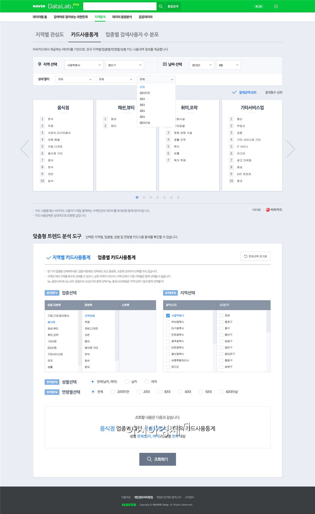 [아시아경제 한진주 기자] 네이버가 BC카드의 카드결제 데이터를 자사 빅데이터 포털 '데이터랩'에 융합했다고 4일 밝혔다.BC카드는 특정인을 확인할 수 없는 비식별 정보의 형태로 네이버 데이터랩에 카드결제 데이터를 제공한다. 데이터랩 사용자들은 검색 클릭 데이터와 카드결제 데이터를 통해 구매행동과 소비패턴을 보다 쉽게 활용할 수 있다.이용자들은 데이터랩에 신설된 '카드사용통계' 기능을 통해 최근 13개월간 특정 지역에서의 카드결제 횟수 또는 결제금액이 높은 업종을 월 단위로 확인할 수 있다. 상세필터를 활용하면 업종·연령·성별로 세분화한 데이터도 확인 가능하다. 맞춤형 트렌드 도구에서는 특정 업종이나 지역을 기준으로, 카드결제규모를 월별로 비교할 수 있는 통계 그래프도 제공된다.'지역별 관심도'와 '카드사용통계'를 연계해 지난 1년간 특정 지역이나 업종에 대한 고객들의 관심도와 실제 결제 규모가 어떻게 변해왔는지 유추할 수 있다. 창업을 위해 고객들의 실제 관심도에 비해 결제 규모가 상대적으로 높은 지역을 찾는 것도 가능하다. 지역별 관심도는 네이버의 지도 지역 정보에 대한 클릭 데이터를 바탕으로 이용자들의 관심도를 통계화해 보여주는 기능이다. 이와 함께 데이터랩은 '지역별 관심도' 서비스 범위를 전국으로 확대한다고 밝혔다. 지난 4월 처음 선보인 지역별 관심도는 강원도 지역을 대상으로 먼저 통계 데이터를 제공해왔다.윤영찬 네이버 부사장은 "데이터랩은 사용자들에게 단순히 방대한 데이터를 제공하기보다 데이터가 가지는 ‘융합’과 ‘확산’의 가치를 사용자들이 보다 편리하게 경험할 수 있도록 하는 것에 집중하고 있다"며 "향후 다양한 민간 공공 분야의 데이터와 융합을 이어나가는 한편, 이를 네이버의 다양한 서비스로 확대하며 ‘데이터 기반 비즈니스 컨설팅 서비스’로 발전해나갈 것"이라고 말했다.한진주 기자 truepearl@asiae.co.kr<ⓒ세계를 보는 창 경제를 보는 눈, 아시아경제(www.asiae.co.kr) 무단전재 배포금지>