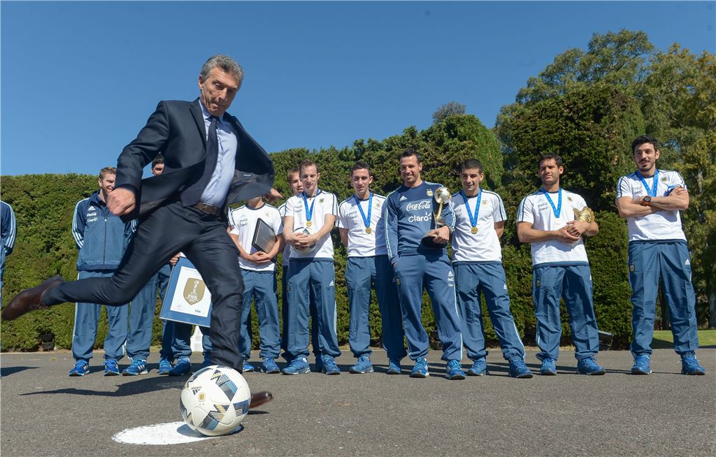 [아시아경제 백종민 기자] 마우리시오 마크리 아르헨티나 대통령이 3일(현지시간) 2016 피파 풋살 대회에서 우승을 차지한 자국 대표팀을 축하하는 자리에서 공을 차 보이고 있다.백종민 기자 cinqange@asiae.co.kr<ⓒ세계를 보는 창 경제를 보는 눈, 아시아경제(www.asiae.co.kr) 무단전재 배포금지>