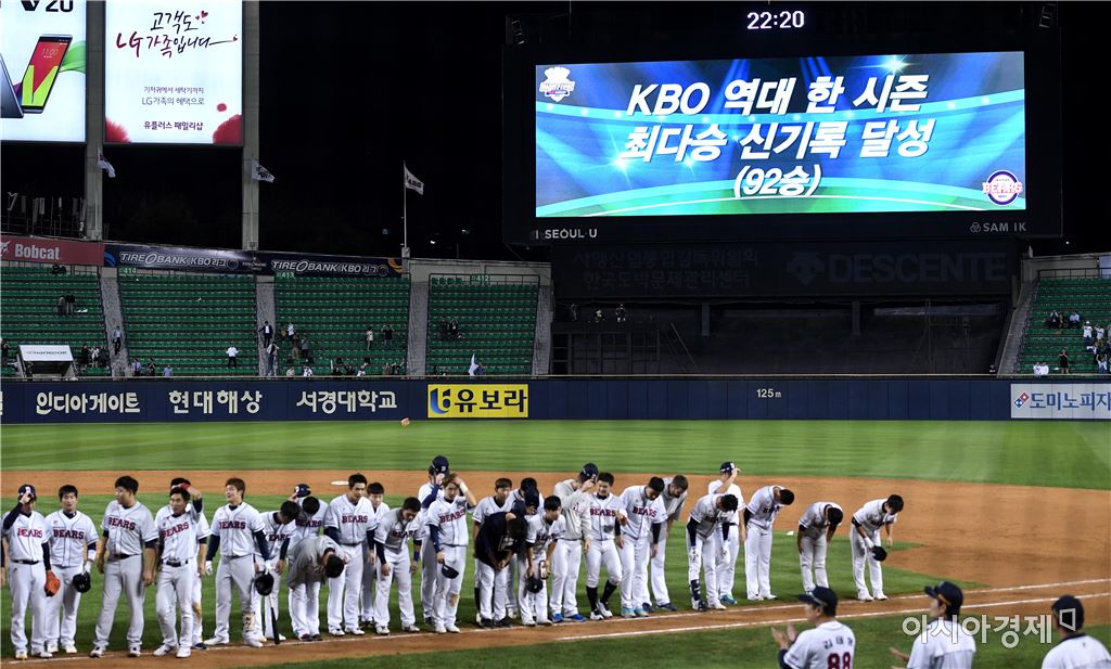 [아시아경제 김현민 기자]프로야구 롯데 자이언츠와 두산 베어스의 2016 KBO리그 경기가 4일 잠실구장에서 열렸다. 두산 선수단이 6-5 승리를 확정한 뒤 팬들을 향해 인사하고 있다. 두산은 KBO리그 역대 한 시즌 최다승(92승) 신기록을 달성했다.김현민 기자 kimhyun81@asiae.co.kr<ⓒ세계를 보는 창 경제를 보는 눈, 아시아경제(www.asiae.co.kr) 무단전재 배포금지>