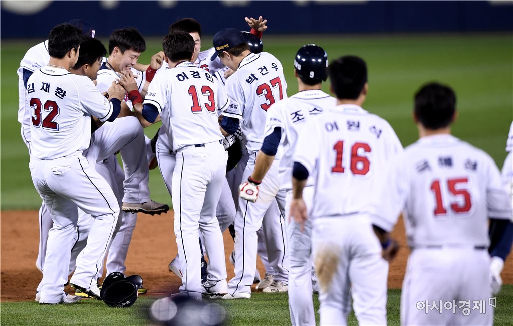 [아시아경제 김현민 기자]프로야구 롯데 자이언츠와 두산 베어스의 2016 KBO리그 경기가 4일 잠실구장에서 열렸다. 연장 10회말 1사 만루에서 두산 정진호가 끝내기 안타를 치고 동료들과 기뻐하고 있다. 두산은 KBO리그 역대 한 시즌 최다승(92승) 신기록을 달성했다.김현민 기자 kimhyun81@asiae.co.kr<ⓒ세계를 보는 창 경제를 보는 눈, 아시아경제(www.asiae.co.kr) 무단전재 배포금지>