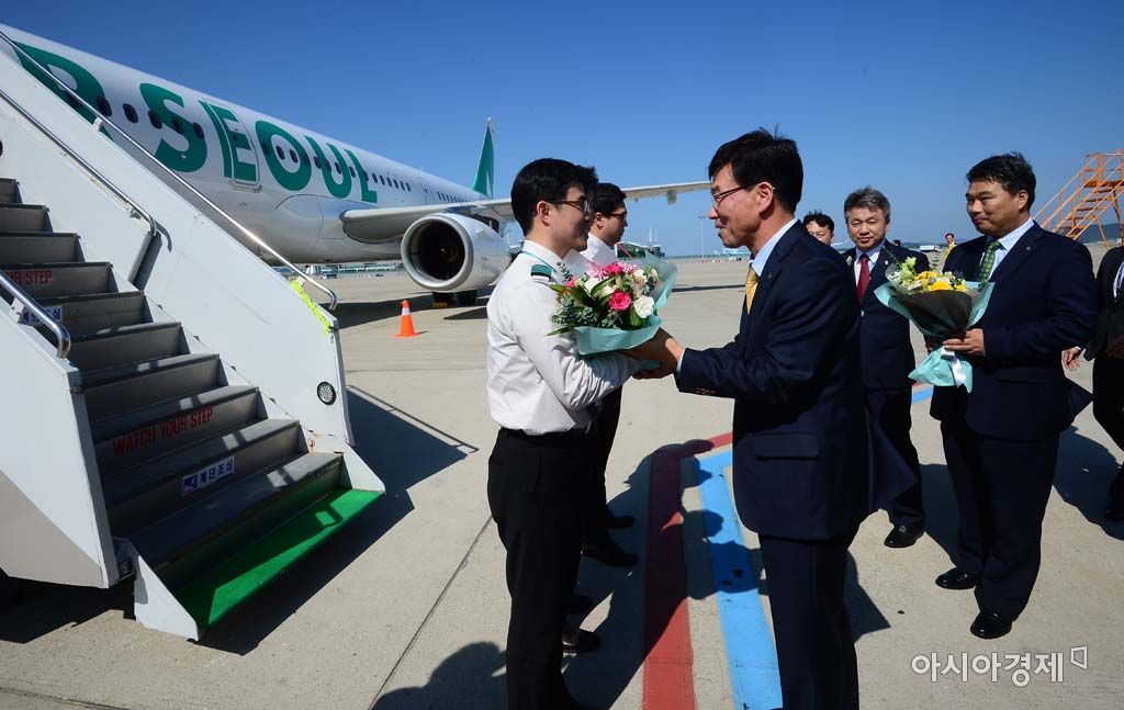 [아시아경제 백소아 기자] 5일 인천광역시 중구 인천국제공항 계류장에서 열린 에어서울 항공기 도입식에서 류광희 에어서울 사장(오른쪽)이 정우영 기장(왼쪽)에게 꽃다발을 전달하고 있다. 에어서울 항공기는 7일 일본 다카마쓰에 첫 취항한다.백소아 기자 sharp2046@asiae.co.kr<ⓒ세계를 보는 창 경제를 보는 눈, 아시아경제(www.asiae.co.kr) 무단전재 배포금지>