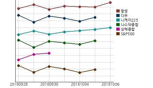전일 뉴욕증권거래소에서 나스닥종합지수는 전일 대비 26.36포인트(0.5%) 오른 5316.02로 마감됐고, S&P500지수는 전일 대비 9.24포인트(0.43%) 오른 2159.73로 마감됐다. 또한 다우산업지수는 전일 대비 112.58포인트(0.62%) 오른 18281.03로 마감됐다.유럽증시는 이탈리아 FTSE MIB증시가 168.56포인트(1.03%) 상승하여 16476.58를 기록하는 반면, 영국 FTSE100증시가 41.09포인트(0.58%) 하락하여 7033.25를 기록하는 등 독일 DAX30, 프랑스 CAC40, 러시아 RTS증시가 모두 하향세를 보였다.아시아증시는 현재 니케이225, 항셍, 홍콩H, 항셍차이나대기업 (R), 말레이시아 KLCI증시가 상승세를 보이는 반면, 인도네시아 IDX종합, 대만가권, 상해A, 상해종합, 상해B증시가 하향세를 보이고 있다.국내금시세