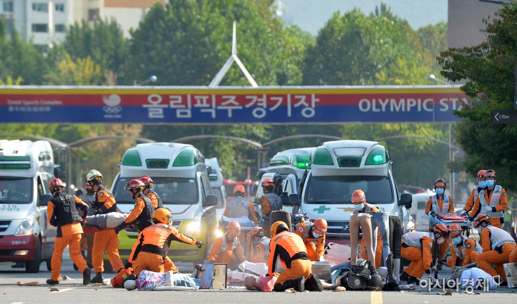 [아시아경제 문호남 인턴기자] 6일 서울 올림픽로 잠실종합운동장 주경기장 입구에서 열린 '2016 국가 대테러 종합훈련'에서 소방대원들이 도심에 일어난 테러 현장을 수습하고 있다.문호남 인턴기자 munonam@asiae.co.kr<ⓒ세계를 보는 창 경제를 보는 눈, 아시아경제(www.asiae.co.kr) 무단전재 배포금지>