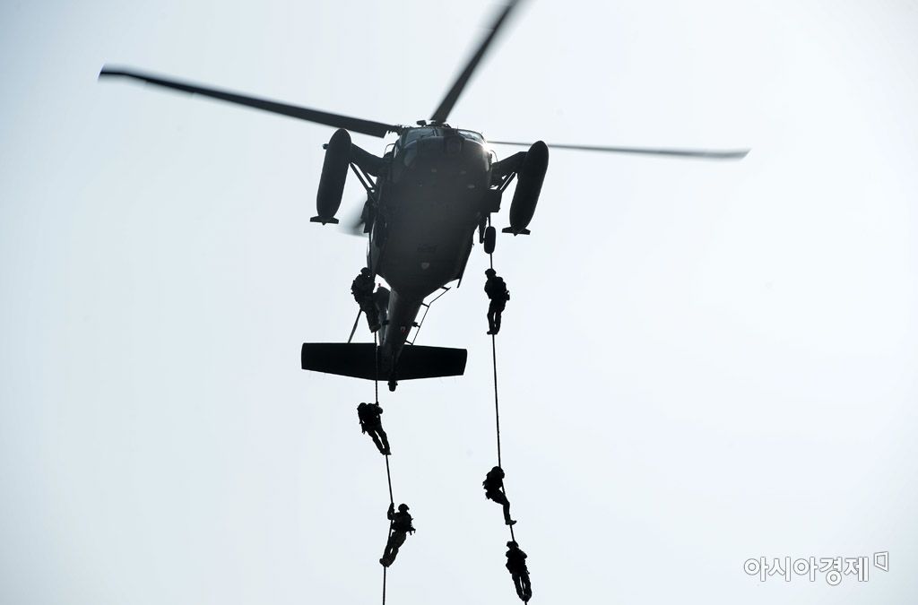 [아시아경제 문호남 인턴기자] 6일 서울 올림픽로 잠실종합운동장 주경기장 입구에서 열린 '2016 국가 대테러 종합훈련'에서 특공대원들이 헬기 레펠을 하고 있다.문호남 인턴기자 munonam@asiae.co.kr<ⓒ세계를 보는 창 경제를 보는 눈, 아시아경제(www.asiae.co.kr) 무단전재 배포금지>