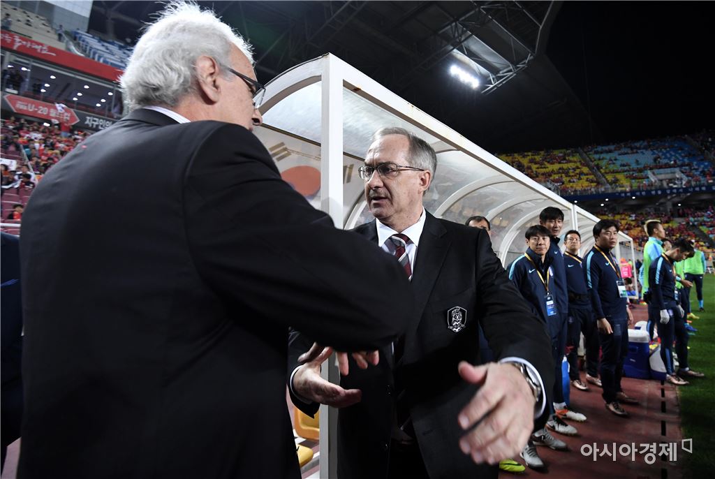 [수원=아시아경제 김현민 기자]울리 슈틸리케 감독이 이끄는 축구 국가대표팀과 카타르의 2016 러시아 월드컵 아시아지역 최종예선 A조 3차전이 6일 수원월드컵경기장에서 열렸다. 경기에 앞서 슈틸리케 감독이 카타르 호르헤 포사티 감독과 인사하고 있다. 김현민 기자 kimhyun81@asiae.co.kr<ⓒ세계를 보는 창 경제를 보는 눈, 아시아경제(www.asiae.co.kr) 무단전재 배포금지>