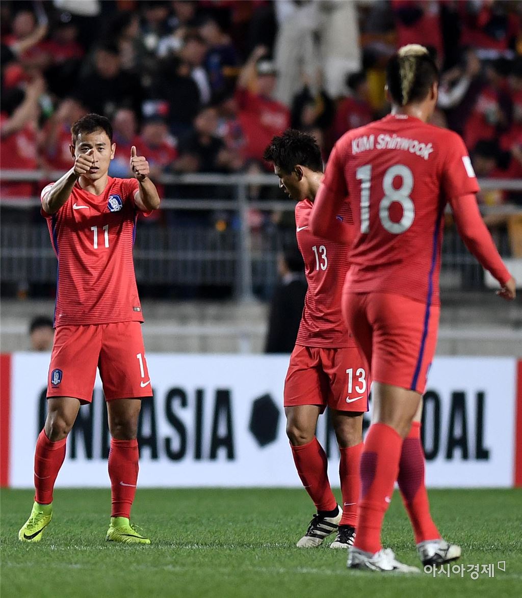 [수원=아시아경제 김현민 기자]울리 슈틸리케 감독이 이끄는 축구 국가대표팀과 카타르의 2016 러시아 월드컵 아시아지역 최종예선 A조 3차전이 6일 수원월드컵경기장에서 열렸다. 지동원이 후반 2-2 동점골을 넣고 어시스트한 김신욱을 향해 엄지손가락을 세우고 있다. 김현민 기자 kimhyun81@asiae.co.kr<ⓒ세계를 보는 창 경제를 보는 눈, 아시아경제(www.asiae.co.kr) 무단전재 배포금지>
