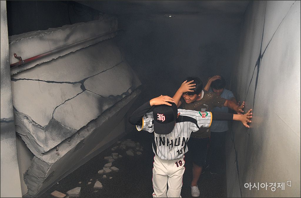 [아시아경제 윤동주 기자] 7일 서울 동작구 보라매안전체험관을 찾은 인헌초등학교 학생들이 소방대원들의 지도를 받으며 지진대비체험을 하고 있다.윤동주 기자 doso7@asiae.co.kr<ⓒ세계를 보는 창 경제를 보는 눈, 아시아경제(www.asiae.co.kr) 무단전재 배포금지>