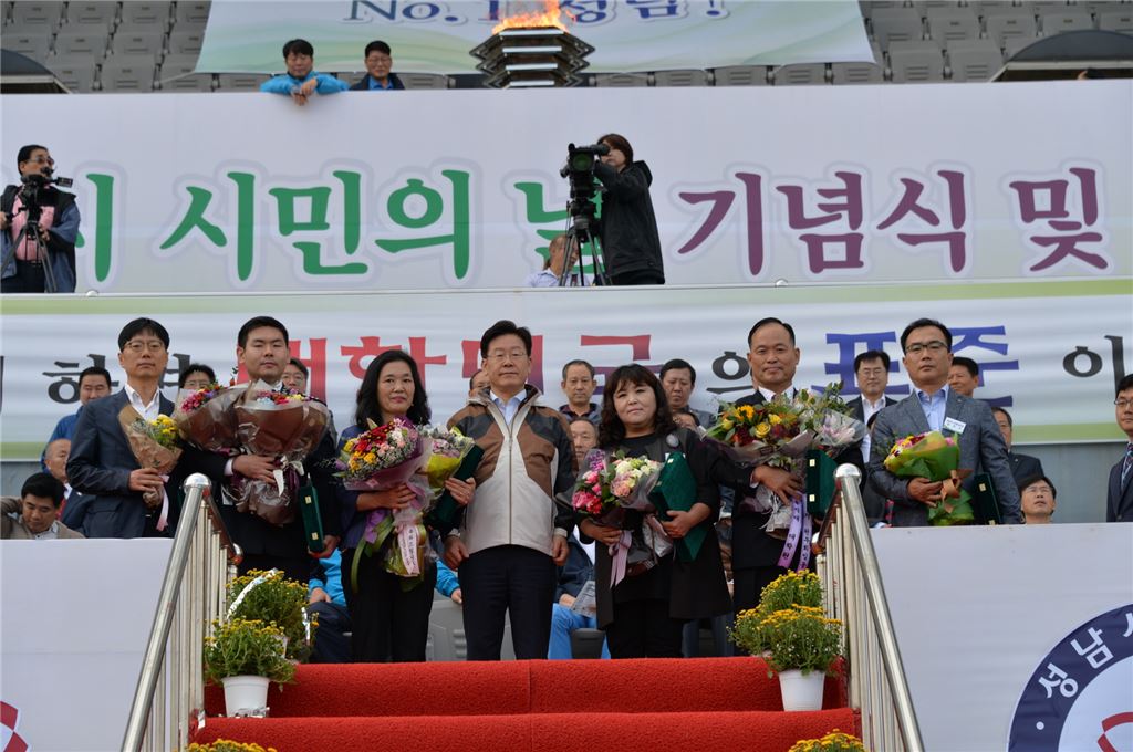 이재명 성남시장이 시민의날 기념식에 참석해 수상자들과 기념촬영을 하고 있다.