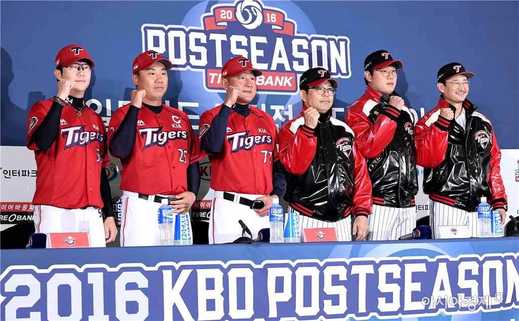 [아시아경제 김현민 기자]프로야구 2016 KBO 포스트시즌 와일드카드 결정전 미디어데이가 9일 잠실구장에서 열렸다. 양팀 선수단이 선전을 다짐하고 있다. 왼쪽부터 양현종, 이범호, 김기태 감독(이상 KIA), 양상문 감독, 류제국, 박용택(이상 LG).김현민 기자 kimhyun81@asiae.co.kr<ⓒ세계를 보는 창 경제를 보는 눈, 아시아경제(www.asiae.co.kr) 무단전재 배포금지>