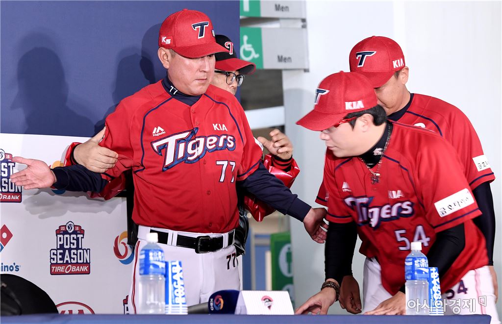 [아시아경제 김현민 기자]프로야구 2016 KBO 포스트시즌 와일드카드 결정전 미디어데이가 9일 잠실구장에서 열렸다. 양팀 선수단이 선전을 다짐하고 있다. LG 양상문 감독이 KIA 김기태 감독을 잡아 세운 위 선수들을 먼저 보내고 있다.김현민 기자 kimhyun81@asiae.co.kr<ⓒ세계를 보는 창 경제를 보는 눈, 아시아경제(www.asiae.co.kr) 무단전재 배포금지>