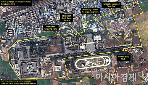 북한은 지난해 노동당 창건 70주년 기념식을 맞아 열병식을 준비했다. 당시 사상 최다 병력을 동원해 최대 규모의 행사를 개최할 것이라는 전망이 나왔다. 사진은 북한 전문 웹사이트 '38노스'가 지난해 촬영한 평양 미림비행장의위성사진.