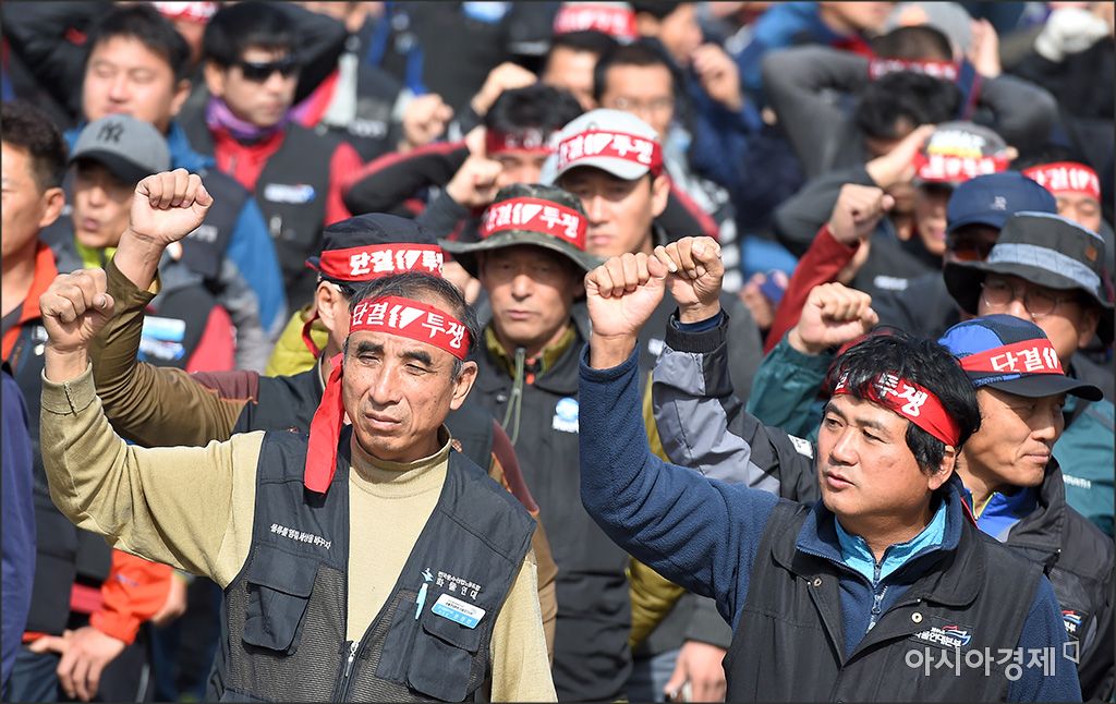 [아시아경제 윤동주 기자] 화물연대노조원들이 10일 경기도 의왕내륙컨테이너기지 인근에서 총파업 출정식에 참석, 구호를 외치고 있다. 화물연대는 정부가 추진하고 있는 '화물운송시장 발전 방안'의 주요 골자인 '1.5톤 미만 소형화물차와 택배용 화물차의 수급 조절제 폐지' 등에 반발, 표준운임제 도입과 지입제 폐지를 주장하고 있다.윤동주 기자 doso7@asiae.co.kr<ⓒ세계를 보는 창 경제를 보는 눈, 아시아경제(www.asiae.co.kr) 무단전재 배포금지>