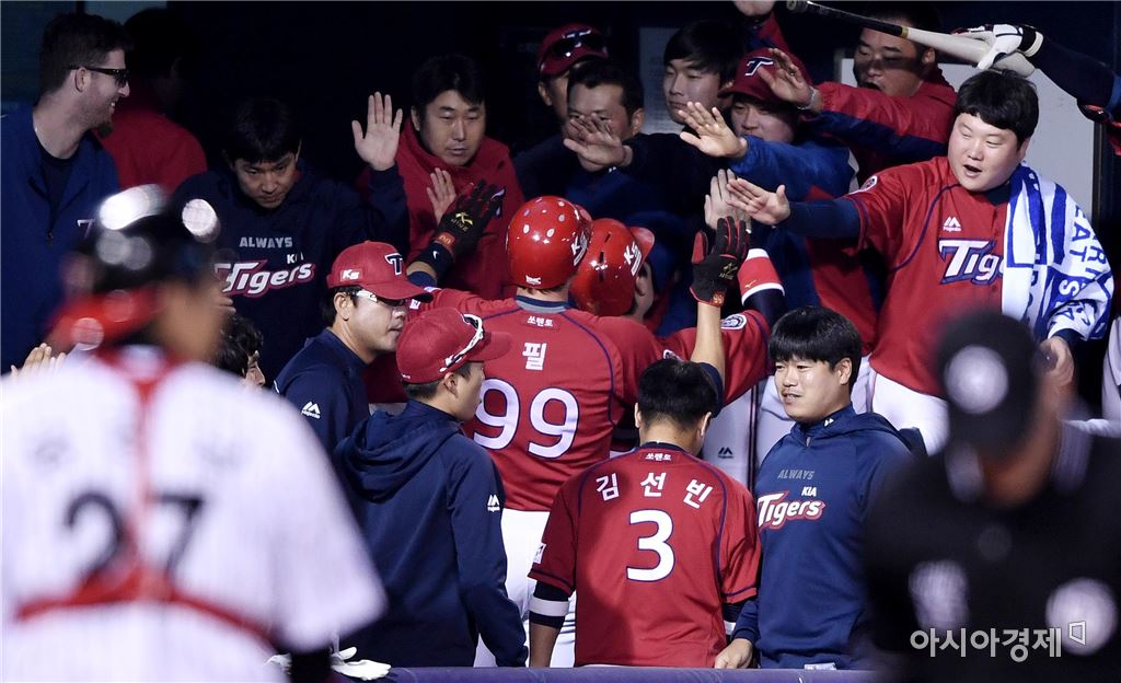 [아시아경제 김현민 기자]프로야구 KIA 타이거즈와 LG 트윈스의 2016 KBO 포스트시즌 와일드카드 결정 1차전이 10일 잠실구장에서 열렸다. 4회초 2사 2,3루에서 KIA 안치홍이 선취 2타점 적시타 때 득점을 올린 나지완과 필이 동료들과 기뻐하고 있다. 김현민 기자 kimhyun81@asiae.co.kr<ⓒ세계를 보는 창 경제를 보는 눈, 아시아경제(www.asiae.co.kr) 무단전재 배포금지>