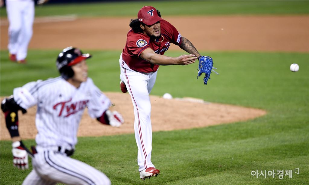 [아시아경제 김현민 기자]프로야구 KIA 타이거즈와 LG 트윈스의 2016 KBO 포스트시즌 와일드카드 결정 1차전이 10일 잠실구장에서 열렸다. 3회말 1사에서 KIA 선발투수 헥터가 LG 김용의의 타구에 맞은 뒤 공을 다시 잡아 1루로 토스하고 있다. 결과는 아웃.김현민 기자 kimhyun81@asiae.co.kr<ⓒ세계를 보는 창 경제를 보는 눈, 아시아경제(www.asiae.co.kr) 무단전재 배포금지>