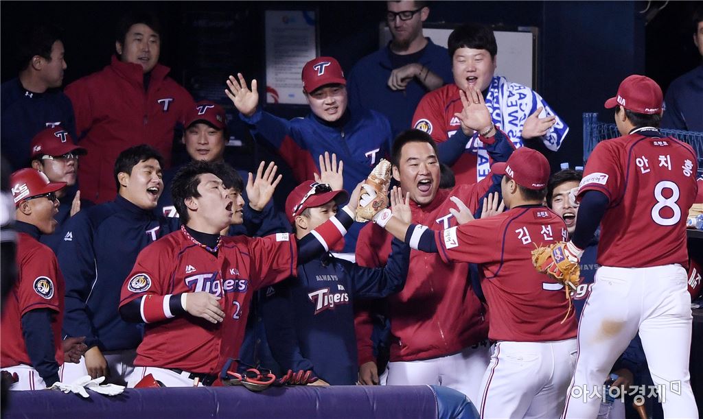 [아시아경제 김현민 기자]프로야구 KIA 타이거즈와 LG 트윈스의 2016 KBO 포스트시즌 와일드카드 결정 1차전이 10일 잠실구장에서 열렸다. 4회말 1사 1루에서 LG 채은성의 타구를 병살로 처리한 KIA 김선빈-안치홍 콤비가 동료들의 환영을 받고 있다. 김현민 기자 kimhyun81@asiae.co.kr<ⓒ세계를 보는 창 경제를 보는 눈, 아시아경제(www.asiae.co.kr) 무단전재 배포금지>