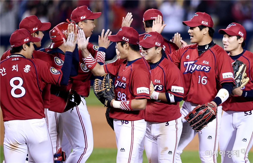 [아시아경제 김현민 기자]프로야구 KIA 타이거즈와 LG 트윈스의 2016 KBO 포스트시즌 와일드카드 결정 1차전이 10일 잠실구장에서 열렸다. KIA 선수들이 4-2 승리를 확정한 뒤 기쁨을 나누고 있다. 김현민 기자 kimhyun81@asiae.co.kr<ⓒ세계를 보는 창 경제를 보는 눈, 아시아경제(www.asiae.co.kr) 무단전재 배포금지>