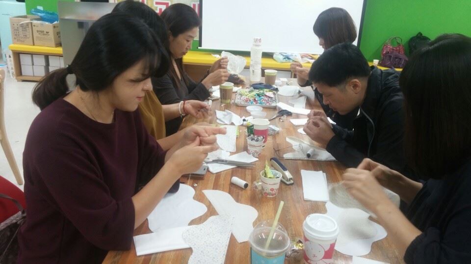 지난 6일 숭실대학교 상상키움관에서 학부모들이 생리대 면패드를 사전 제작해보고 있다.<br />