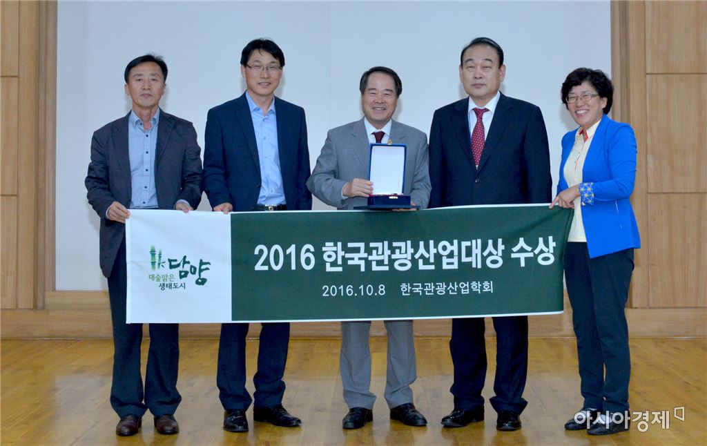 담양군이 한국관광산업학회가 주최하는 2016 한국관광산업대전 지방자치단체 부문에서 ‘한국관광산업대상’을 수상, 기념촬영하고 있다. 사진=담양군