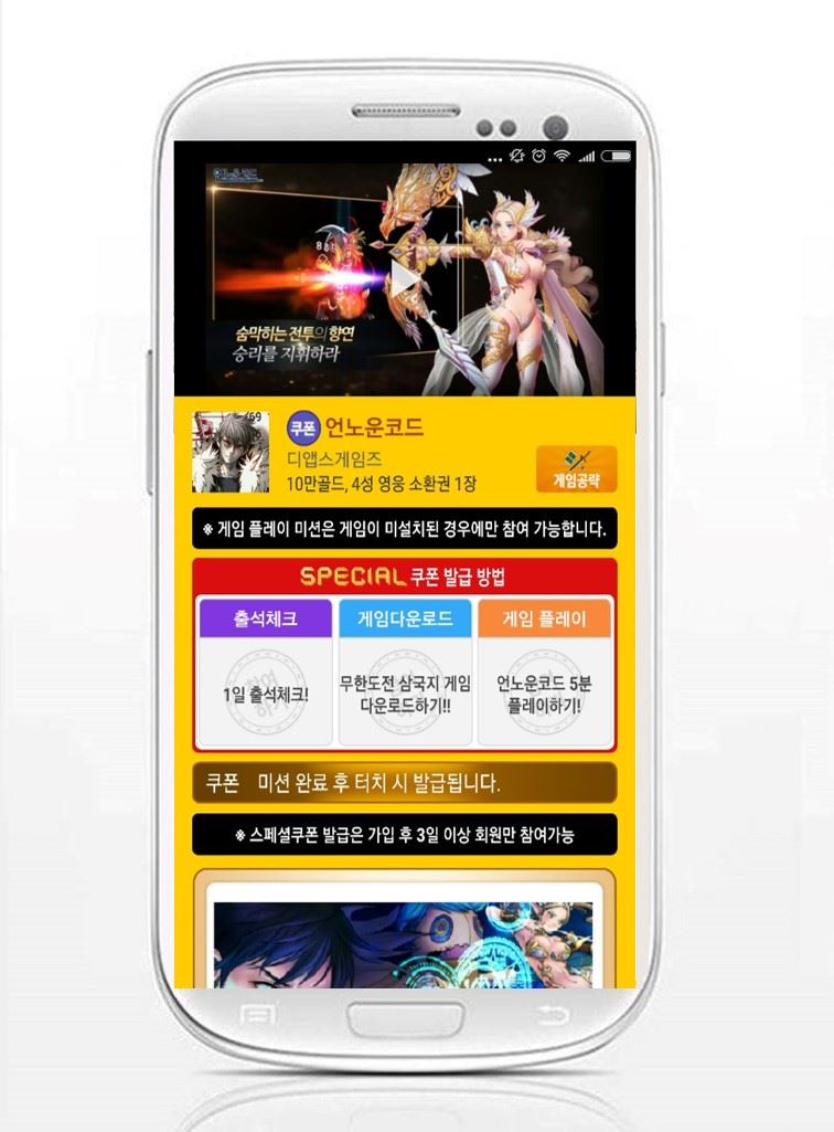 이번에 쿠폰을 추가한 게임은 ‘언노운코드’로 ‘1일 출석체크’, ‘게임 다운로드’, ‘5분 플레이’ 세 가지 미션을 모두 완료한 유저에게 ‘10만 골드’, ‘4성 영웅 소환권 1매’로 구성된 스페셜 쿠폰을 지급한다.한편, 김칸비 작가와 후파 작가가 레진코믹스에서 연재 중인 동명의 웹툰을 원작으로 한 모바일게임 ’언노운코드’는 디지털 매체를 통해 지구를 침공한 ‘언노운코드’에 맞서는 주인공 윤필의 이야기를 그리고 있다. TCG와 RPG가 결합된 형태의 이 게임은 지난달 5일 ‘언노운코드’ OST를 발매해 유저들 사이에서 화제를 모은 바 있다.온라인이슈팀 issue@asiae.co.kr<ⓒ세계를 보는 창 경제를 보는 눈, 아시아경제(www.asiae.co.kr) 무단전재 배포금지>