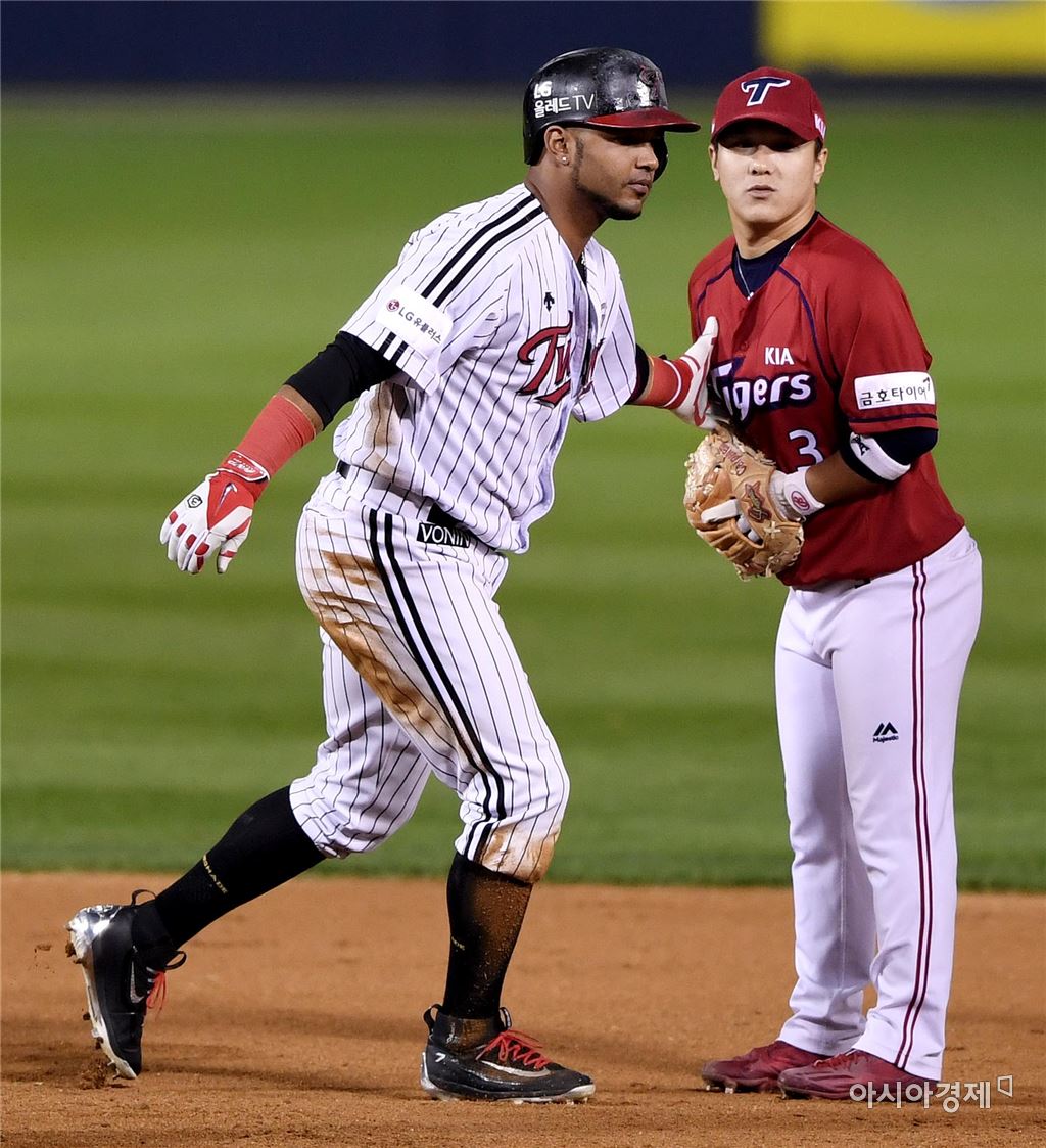 [아시아경제 김현민 기자]프로야구 KIA 타이거즈와 LG 트윈스의 2016 KBO 포스트시즌 와일드카드 결정 2차전이 11일 잠실구장에서 열렸다. 4회말 무사 1루에서 LG 오지환의 2루수 땅볼 때 1루주자 히메네스가 KIA 유격수 김선빈을 향해 슬라이딩한 뒤 미안함을 표시하고 있다.김현민 기자 kimhyun81@asiae.co.kr<ⓒ세계를 보는 창 경제를 보는 눈, 아시아경제(www.asiae.co.kr) 무단전재 배포금지>