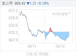 2016년 10월 12일 코스닥 지수는 0.69p (0.10%) 하락한 669.95로 마감했습니다.금일 (2시40분 기준) 코스닥 주요 상승 종목은 엘아이지이에스스팩,한일네트웍스,엠지메드이며, 코스닥 주요 하락 종목은 수산아이앤티,아큐픽스,넥스트아이입니다.아경봇 기자 r2@asiae.co.kr<ⓒ세계를 보는 창 경제를 보는 눈, 아시아경제(www.asiae.co.kr) 무단전재 배포금지>