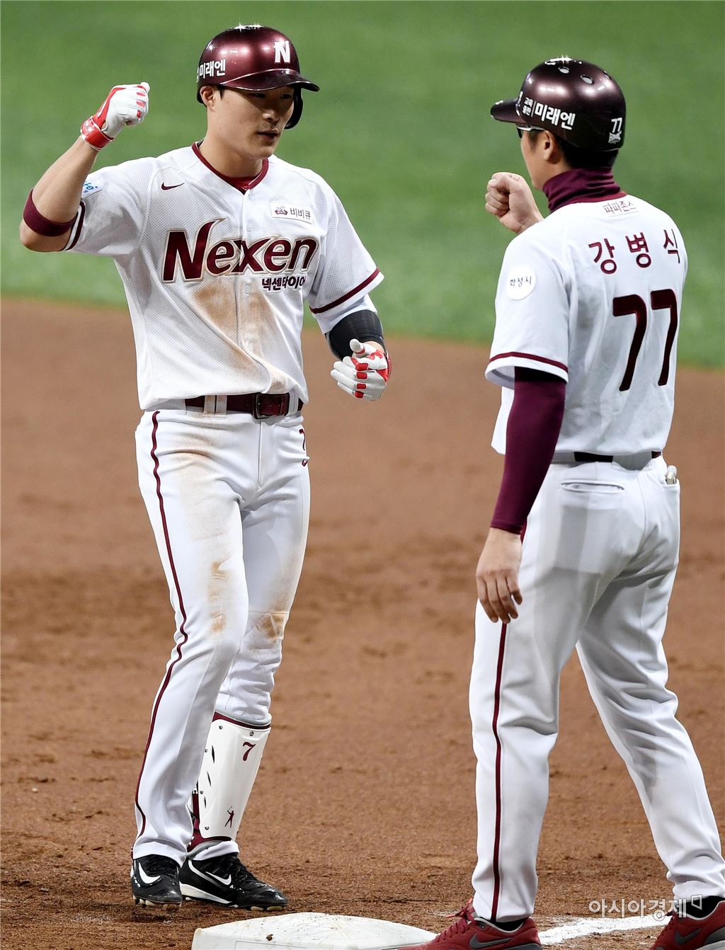 [아시아경제 김현민 기자]프로야구 LG 트윈스와 넥센 히어로즈의 2016 KBO 포스트시즌 준플레이오프 1차전이 13일 고척스카이돔에서 열렸다. 1회말 1사 1루에서 넥센 김하성이 우전 안타를 치고 강병식 코치와 하이파이브하고 있다. 김현민 기자 kimhyun81@asiae.co.kr<ⓒ세계를 보는 창 경제를 보는 눈, 아시아경제(www.asiae.co.kr) 무단전재 배포금지>