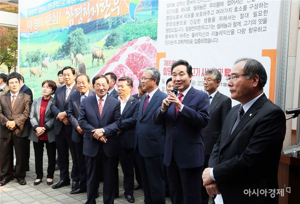 제6회 함평천지 한우고기 소비촉진 행사가 정세균 국회의장, 추미애 더불어민주당 대표, 김재수 농식품부장관, 이낙연 전남지사, 이개호·김무성·주승용·최경환 국회의원, 안병호 함평군수, 이윤행 함평군의회 의장, 임용수·정정희 도의원, 임희구 함평축산업협동조합장, 양규남 재경함평군향우회장 등이 참석한 가운데 14일 국회 후생관 앞에서 열렸다. 이낙연 전남지사가 인사말하고 있다.