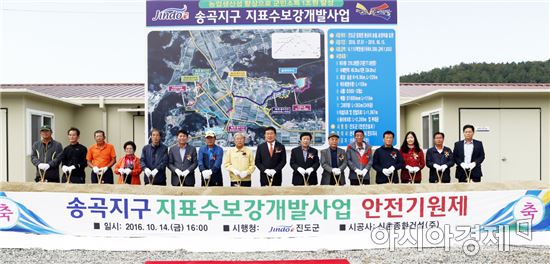 [아시아경제 노해섭 기자]진도군이 사업비 61억원을 투입해 추진하는 ‘임회면 송곡지구 지표수 보강 개발사업’의 안전기원제를 14일 송월마을 인근 현장에서 개최했다. 이 사업은 임회면 송월, 송정, 봉상, 중만마을 등 농가들이 벼와 겨울대파, 월동배추 등 밭작물을 재배하는데 있어 송곡 저수지의 용수 부족 어려움을 해결하기 위해 시행한다. 오는 2019년 상반기 완공 예정이며, 용수로와 진입·이설도로, 취수시설 등을 설치하는 공사이다. 사업이 완료되면 수원공 시설이 확장·보강되어 저수량이 기존에 7만7천 톤에서 21만 톤으로 3배 이상 증가해 농업용수 원활한 공급으로 농업 소득 향상이 기대된다. 이동진 군수는 “송곡지구 지표수 보강개발사업이 추진되면 안정적인 영농생산 기반조성으로 보다 편리하게 농업소득을 올리게 될 것”이라고 말했다. 한편 이날 안전기원제에는 이동진 진도군수, 시공사, 지역주민 등 100여명이 참석해 행사를 가졌다.노해섭 기자 nogary@<ⓒ세계를 보는 창 경제를 보는 눈, 아시아경제(www.asiae.co.kr) 무단전재 배포금지>