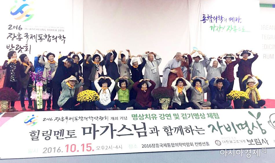 "15일 박람회장 컨벤션관서 약 천 여명 참석, 자비 명상 프로그램 참가자들 ‘호평’"[아시아경제 노해섭 기자]2016장흥국제통합의학박람회(조직위원장 김성)가 15일 주말을 맞아 힐링멘토 ‘마가스님’과 함께하는 명상 치유 체험인 ‘나는 내 인생의 주인공’을 진행했다.박람회장 주제관 2층 컨벤션관에서 열린 이날 프로그램에는 약 천여 명의 관람객이 참석했다. 마가스님은 전남 고흥출신으로 EBS <초대석>, 불교TV <마음 꽃이 피었습니다> 등 방송 출연과 다수 저서의 집필을 통해 대중적인 인지도가 높은 스님이다. 제9대 동국대학교 정각원(교법사)소속으로 현재 사단법인 자비명상의 대표를 맡고 있다. 이날 프로그램은 자기 긍정과 자신에 대한 자비의 마음, 사회생활에서 원만한 대인관계에 도움을 주는 ‘자비명상’을 관람객들이 직접 체험해 볼 수 있는 기회를 제공하기 위해 마련됐다.이날 강연은 자비명상 프로그램과 상담 프로그램으로 나뉘어 진행됐다. 자비명상 프로그램은 자신에 대한 자비로움을 막는 부정적인 마음과 경험을 풀어내 자신에 대한 확신과 타인을 있는 그대로 포용하고 받아들일 수 있도록 하는 점에 초점을 맞춰 진행됐다.
