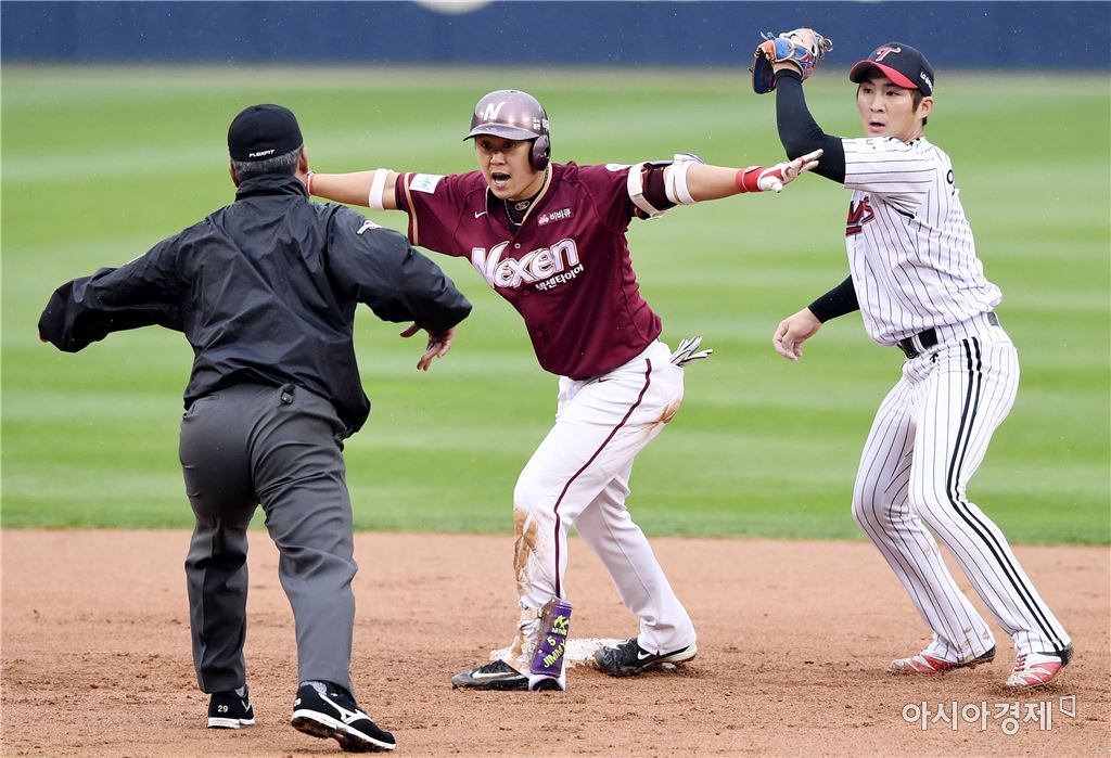 [아시아경제 김현민 기자]프로야구 넥센 히어로즈와 LG 트윈스의 2016 KBO 포스트시즌 준플레이오프 3차전이 16일 잠실구장에서 열렸다. 5회초 1사 2루에서 넥센 김지수가 1타점 적시타를 치고 2루까지 진루하다 LG 오지환에 태그아웃 되고 있다.김현민 기자 kimhyun81@asiae.co.kr<ⓒ세계를 보는 창 경제를 보는 눈, 아시아경제(www.asiae.co.kr) 무단전재 배포금지>