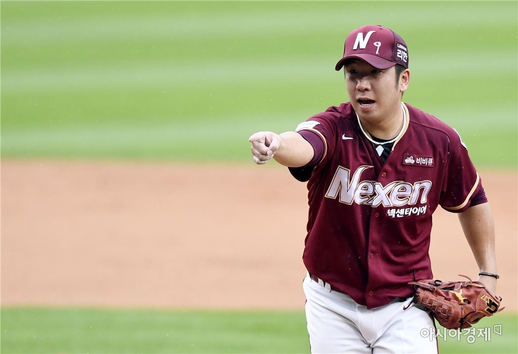 [아시아경제 김현민 기자]프로야구 넥센 히어로즈와 LG 트윈스의 2016 KBO 포스트시즌 준플레이오프 3차전이 16일 잠실구장에서 열렸다. 넥센 선발 신재영이 3회말 1사 2루에서 LG 박용택을 삼진으로 처리하며 박동원 포수를 향해 손짓하고 있다.김현민 기자 kimhyun81@asiae.co.kr<ⓒ세계를 보는 창 경제를 보는 눈, 아시아경제(www.asiae.co.kr) 무단전재 배포금지>