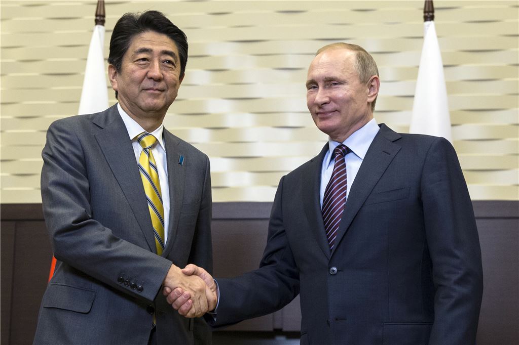 ▲지난 5월 아베 신조 일본 총리(왼쪽)가 블라디미르 푸틴 러시아 대통령과 러시아 소치에서 정상회담을 갖고 악수하고 있는 모습. (AP=연합뉴스)