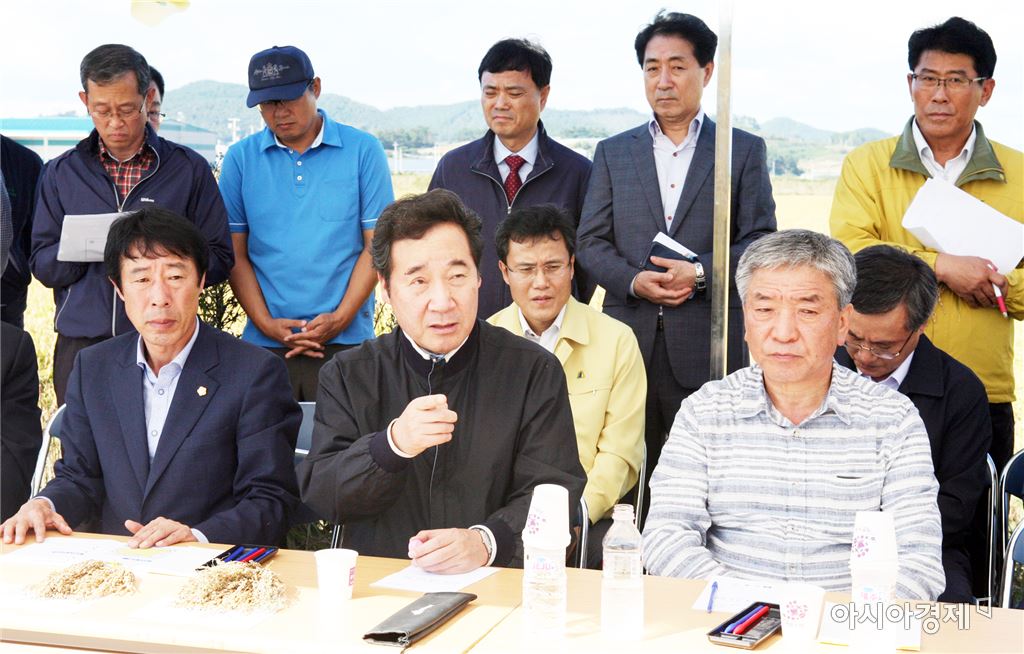 이낙연 전남지사가 17일 오후 고흥군 도덕면 가야리 벼 수발아 피해현장을 방문, 송봉종 고흥군 농업축산 과장으로부터 벼 수발아 피해현황에 대해 설명을 듣고 있다. 사진제공=전남도
