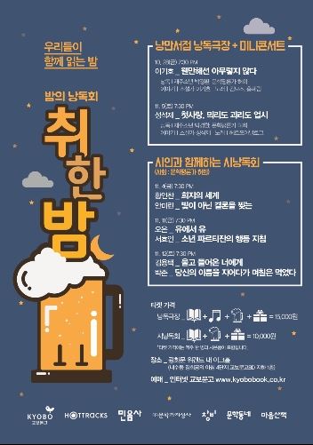 [아시아경제 조민서 기자]교보문고가 이달 말 문학 낭독과 음악, 술이 어우러진 낭독회 '취한 밤'을 진행한다고 18일 밝혔다. 이번 공연은 28일과 11월4일, 5일, 11일, 12일 총 5회에 걸쳐 서울시 종로구 내수동 교보문고 사옥 지하 1층 워켄드 내 공연장 아크홀에서 열린다. 독자들에게 새로운 문화적 체험과 독서의 경험을 확대하고자 하는 목적에서 진행된다.'취한 밤' 낭독회는 음악이 흐르는 가운데 단편소설을 낭독하는 '낭만서점 낭독극장'과 시인이 자신의 시를 직접 들려주는 '시낭독회'로 나눠서 진행된다. 문학평론가 허희와 뮤지션 박경환이 전체 진행을 맡아 작가와 함께 작품에 대한 이야기를 나눈다. '낭만서점 낭독극장'은 28일과 11월5일에 진행된다. 28일에는 소설가 이기호의 '웬만해선 아무렇지 않다' 작품 이야기와 가수 김므즈, 홍혜림의 노래가 펼쳐진다. 11월5일에는 소설가 성석제의 '첫사랑', '믜리도 괴리도 업시' 작품 이야기와 가수 '헤르쯔 아날로그'의 노래로 문학과 음악이 어우러진 공연으로 채워진다. 소설 낭독은 연극배우 김성현과 문학평론가 허희, 뮤지선 박경환이 맡았다. '시낭독회'는 11월4일, 11일, 12일에 진행된다. 4일에는 시인 황인찬과 안미린, 11일에는 시인 오은과 서효인, 12일에는 시인 김용택과 박준의 등이 출연한다. 이번 공연은 매 회 80석 규모로 저녁 7시30분부터 2시간 동안 진행된다. 티켓을 구매하는 전 고객에게는 공연장에서 맥주 한 병(작은 병)이 무료 제공된다. 교보핫트랙스, 민음사, 문학과지성사, 창비, 문학동네, 마음산책 등이 함께 한다. '낭독극장'의 티켓가격은 1만5000원이며 '시낭독회'의 티켓 가격은 1만원이다. 티켓 구입은 인터넷교보문고 문화서비스 낭독공감 페이지(https://goo.gl/VUByqe)에서 가능하다.조민서 기자 summer@asiae.co.kr<ⓒ세계를 보는 창 경제를 보는 눈, 아시아경제(www.asiae.co.kr) 무단전재 배포금지>