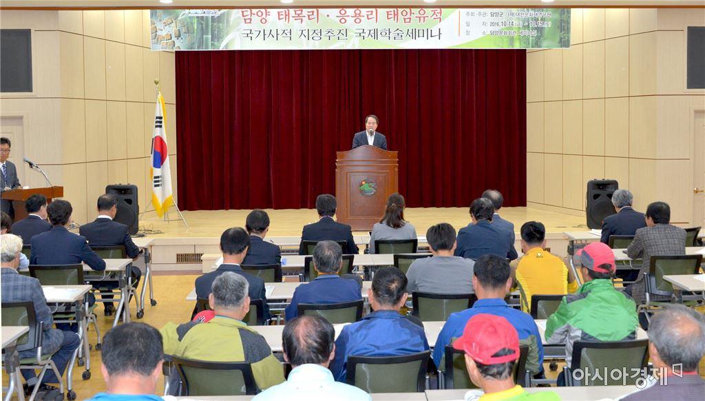 담양군과 (재)대한문화재연구원이 공동 주최한 ‘태암유적 국가사적 지정추진 국제 학술세미나’가 100여명이 참석한 가운데 최형식 담양군수가 인사말을 하고 있다. 사진=담양군
