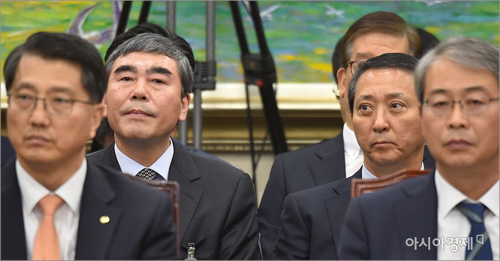 [아시아경제 윤동주 기자] 늑장 공시 의혹으로 언론의 질타를 받고 있는 한미약품 이관순 대표와 다단계 영업방식으로 언론의 질타를 받고 있는 LG유플러스 권영수 대표가 18일 국회에서 열린 정무위원회의 금융위원회 등에 대한 종합국정감사에 증인신분으로 출석, 나란히 앉아 있다.윤동주 기자 doso7@asiae.co.kr<ⓒ세계를 보는 창 경제를 보는 눈, 아시아경제(www.asiae.co.kr) 무단전재 배포금지>